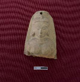 | Description / विवरण | A terracotta fragmentary female bust red in colour, there is a turban over the head and the earlobes are hanging. The figure is broken from the bust portion and there is a perforation on the turban. |
