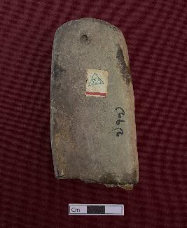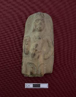 | Description / विवरण | A terracotta male figure in a standing position. The right hand is holding a round thing and the left hand is resting on the waist. The face is mutilated. Headgear and elongated ear rings can be seen. A knife is fixed on the front part of the waist. A perforation is visible on the backside. |