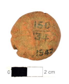 | Description / विवरण | It is a Terracotta sealing of baked clay. The upper half, which separated from the lower by double horizontal line, depicting two deer and a wheel in-between, below it there is legend which reads Sri Saddharmmachakkra. |