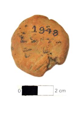 | Description / विवरण | It is a Terracotta sealing of baked clay. The upper half, which separated from the lower by double horizontal line, depicting two deer and a wheel in-between, below it there is legend which reads Sri Saddharmmachakkra. |