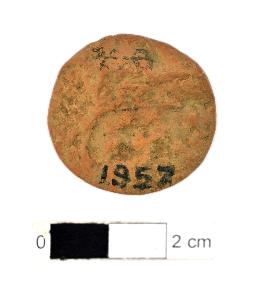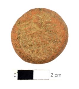 | Description / विवरण | It is a Terracotta sealing of baked clay. The upper half, which separated from the lower by double horizontal line, depicting two deer and a wheel in-between, below it there is no legend. |