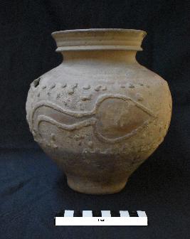 | Description / विवरण | Terracotta pot with broken spout. There is applique peeple leaf design in loop on the body of the pot. |