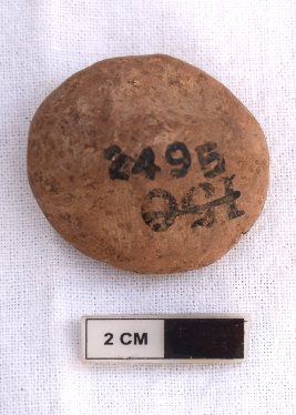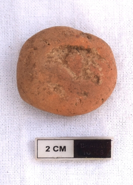 | Description / विवरण | It is a Terracotta sealing of baked clay. The upper half, which is separated from the lower by double horizontal line, depicting two deer and a wheel in-between, below it there is legend written in Brahmi. |