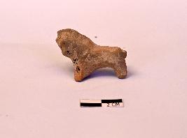 | Description / विवरण | A well baked handmade animal ( unidentified) figurine. It has a stout body with long raised neck with roughly modeled stumpy legs. The front limbs are joint together. A straight tail can be seen at the back. The head and face are completely mutilated |