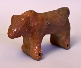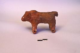 | Description / विवरण | Unidentified quadruped animal figure with a small hump , roughly modeled tail and completely joint legs .Perforation on the bottom outer part of legs provided for attaching wheels so that it can be used as a wheeled toy. The terracotta surface is abraded chopped off at places |
