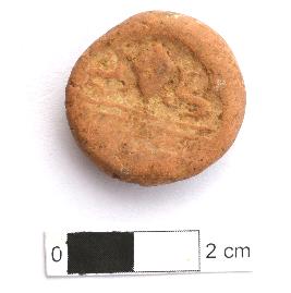 | Description / विवरण | It is a Terracotta sealing of baked clay. The upper half, which is separated from the lower by double horizontal line, depicting two deer and a wheel in-between, below it there is no legend. |