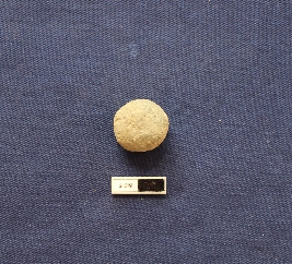 | Description / विवरण | A sling ball in a spherical shape. The surface is partially weathered and dull red in color. |
