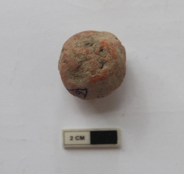 | Description / विवरण | A sling ball in a spherical shape. It is red in color and partially damaged. |