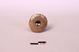 | Description / विवरण | A ring shaped terracotta bead having a thick section . Its outer surface looks chipped and mutilated . The drill hole has concave wear and is chipped and abraded |
