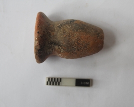 | Description / विवरण | A terracotta stamp. It is red in color and partially damaged. |