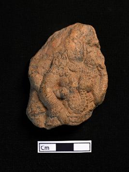 | Description / विवरण | Fragmentary Terracotta plaque, showing a female figure. The figurine is ornamented with long ear rings, bangles, armlet and long necklace. Only left hand is visible and face is eroded. |