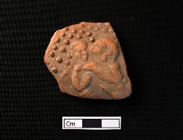 | Description / विवरण | Fragmentary Terracotta plaque, showing a portion of an amorous couple. Border is ornamented with ornamented dotted design. The object is red in colour with smooth surface. |