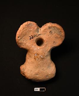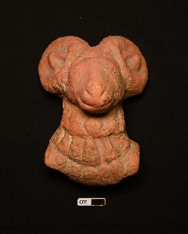 | Description / विवरण | A terracotta ram is decorated with a head band having a central floral motif and a broad collar. The mouth of the ram is slightly open. Ears are decorated with incision technique. The neck portion bears a number of chain like incisions. A perforation can be seen in the side. |