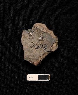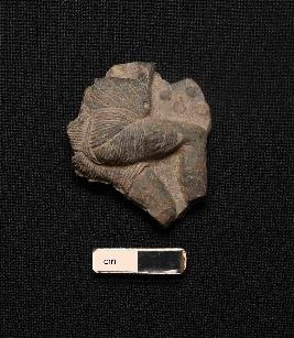 | Description / विवरण | A fragmented terracotta plaque showing a part of a human figurine. The figurine is placed in one side form. Dhoti like object can be seen. The object is black in colour |
