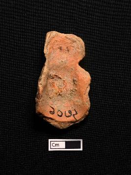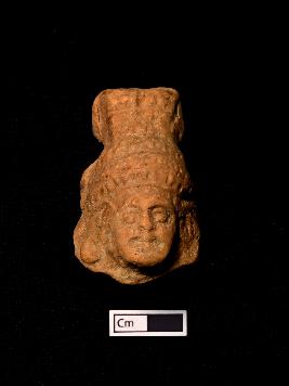 | Description / विवरण | A terracotta head of a human which is decorated with a head gear and head band bears a number of chain like incisions. Eyes and nose is clearly visible. Elognated ear can be seen. |
