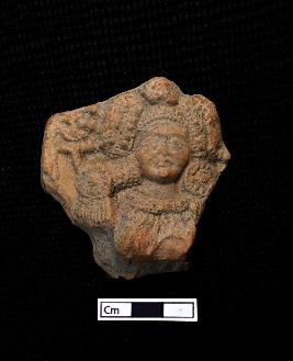 | Description / विवरण | A fragmented terracotta plaque showing a female figurine with a highly ornamented headgear. Circular earrings and decorated necklace can be seen. |