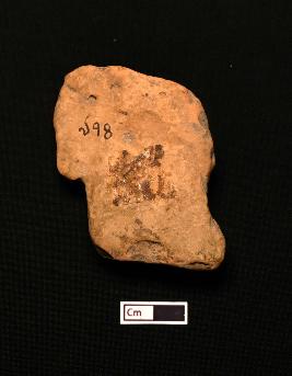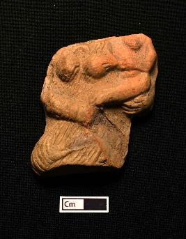 | Description / विवरण | A fragmented terracotta plaque showing an image of mother and child. Child is in her left lap. Head is not visible. |