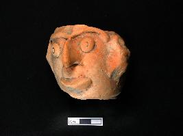 | Description / विवरण | This is the representation of a grotesque with smooth surface and red colour. It has big circular eyes, sharp nose, thick lips and party visible ears. The purpose of this remains unexplained. |