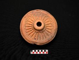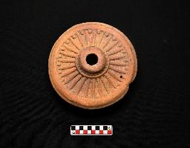 | Description / विवरण | A well decorated terracotta wheel of a toy cart which is red in colour with smooth surface. The central of the wheel is thick and has a perforation is there. The surface of the object is decorated with spoked design. A tiny hole is there on the surface |