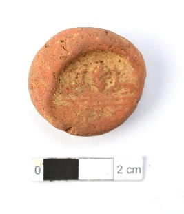 | Description / विवरण | It is a circular terracotta sealing of baked clay, the upper half, which is separated from the lower by double horizontal line, depicting two deer and a wheel in-between. |