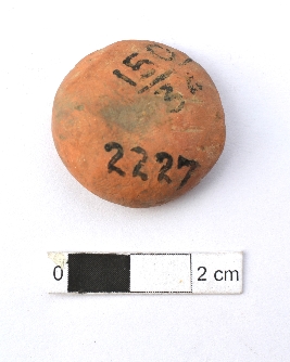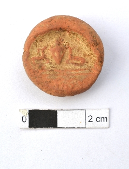 | Description / विवरण | It is a terracotta sealing of baked clay. The upper half, which is separated from the lower by double horizontal line, depicting two deer and a wheel in-between, there is legend below which is weathered. |