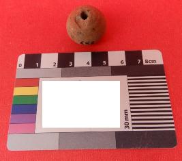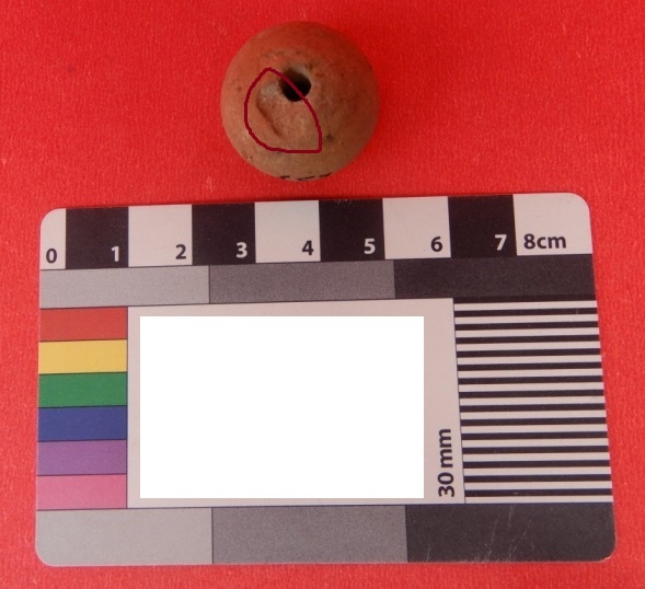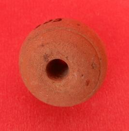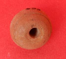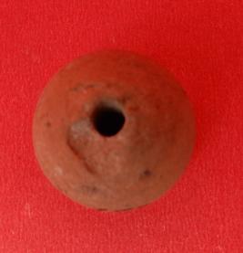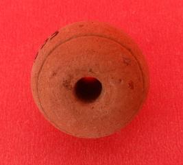 An Areca nut shaped Terracotta Bead which is light red in color. An out line is marked as a design of the bead