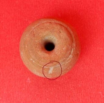 An Areca nut shaped Terracotta Bead which is light red in color. a circular line is marked on its outer surface.