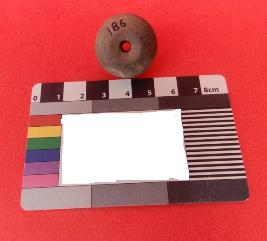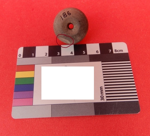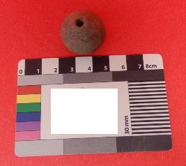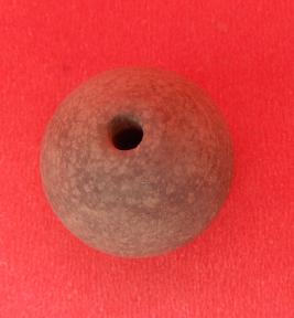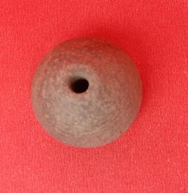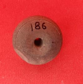 An Areca nut shaped Terracotta Bead light black in color. The bead have rough marks on its surface.