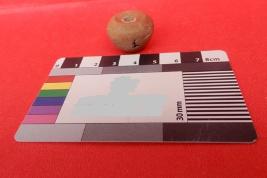 An Areca nut shaped Terracotta Bead light red in color. At one side of the Bead is depicted flat.