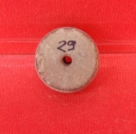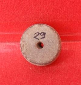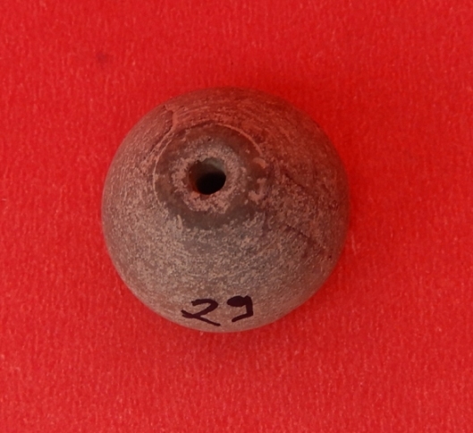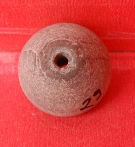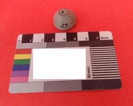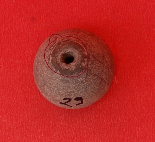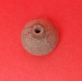 An Areca nut shaped Terracotta Bead which is light black in color. At the conical side of the Bead it is decorated with a one thin line groove. another side of the bead is flat.