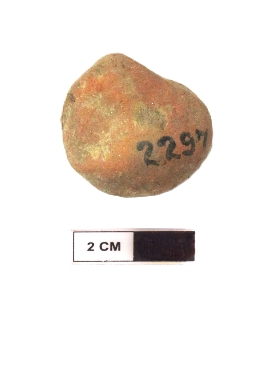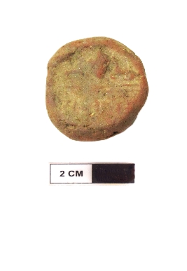 | Description / विवरण | It is a terracotta sealing of baked clay. The upper half, which is separated from the lower by double horizontal line, depicting two deer and a wheel in-between. The legend below is weathered. |