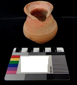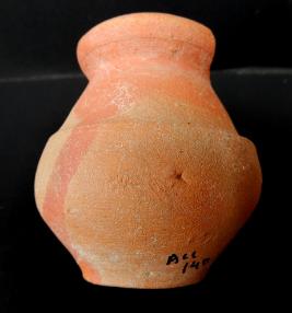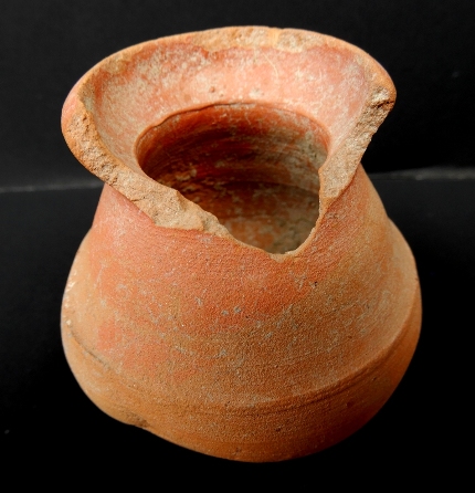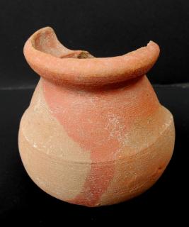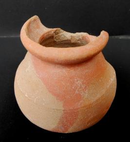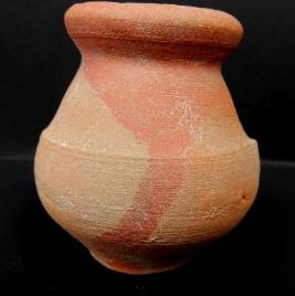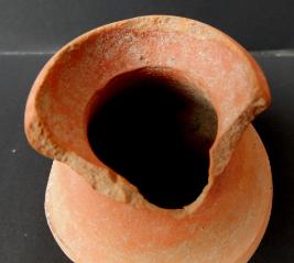 A Miniature Terracotta red ware Pot medium in fabric, which have extended out turned rim and shallow base. In the middle of the pot a shallow lines is depicted.