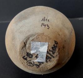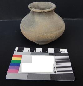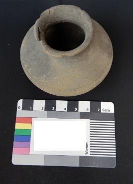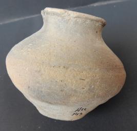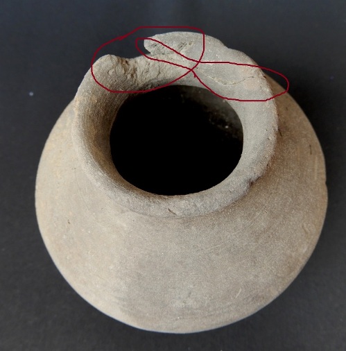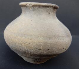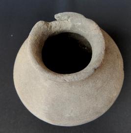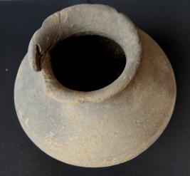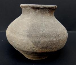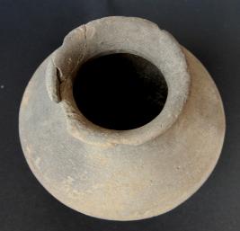 A Miniature Terracotta Red ware Pot which is blackish grey color and medium in fabric having out turned rim, Pot have a shallow base. Some portion of the rim is mended with original rim part of the pot.