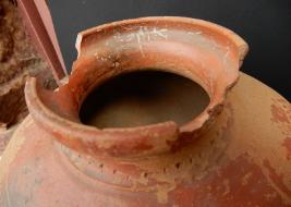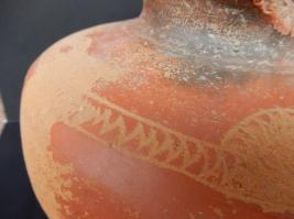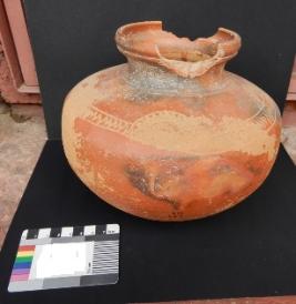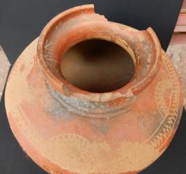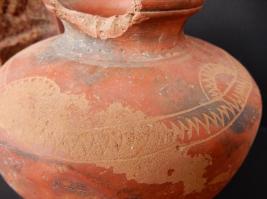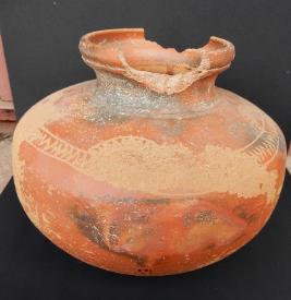 A Terracotta red ware Pot which has in curved rim and medium in fabric. Pot have a zig zag design on its outer shoulder portion. Red slip applied on the pot as outer protection layer.