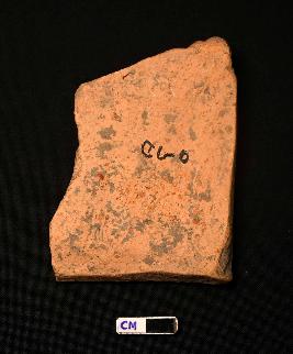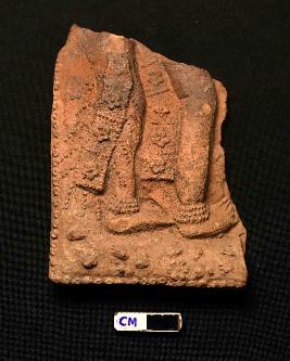 | Description / विवरण | A fragmented terracotta plaque showing human figurine which is red in colour. The figurine is intact from thigh upto the feet and rest is missing. An anklet is visible. The plaque is decorated with floral and beaded design. |