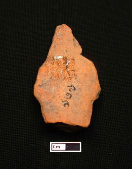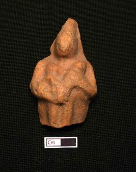 | Description / विवरण | A fragmented terracotta plaque showing a figurine upto thigh. The face is completely eroded with a conical headgear. Both of the hands are holding an object. |