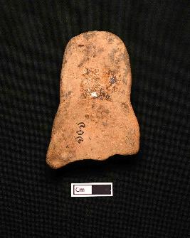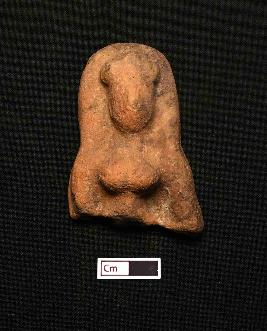 | Description / विवरण | A fragmented terracotta plaque showing a female figurine with headgear. The face is completely eroded. Breasts are prominent. |