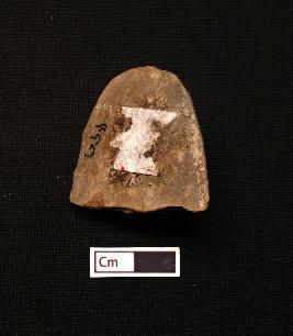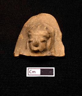 | Description / विवरण | A fragmented terracotta plaque showing a human face with headgear. Eyes, nose and lips are partly visible. The object is partialy eroded. |