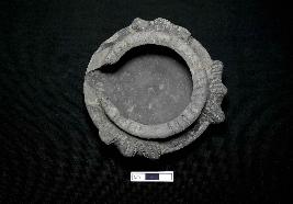 | Description / विवरण | Terracotta lamp, it is circular in shape with flatted base. Wick is intact and slip treatment given in black colour. It has straight rim with jagged design on the outer portion of the rim.. The surface of the object is smooth. |