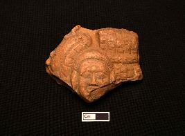 | Description / विवरण | A terracotta fragmentary plaque showing a face of a human. It is adorned with decorated circular headgear. Face in complete visible with a sign of cut marks. Decoration can be seen around the face. The object is red in colour with smooth surface. |