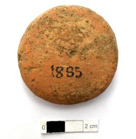 | Description / विवरण | It is an almost circular terracotta sealing of baked clay, the impression of Buddhist creed written on it in sixteen lines can be observed. |