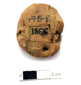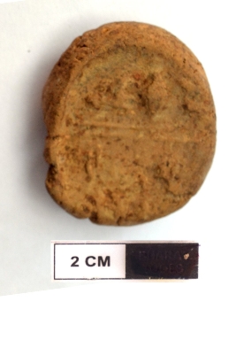 | Description / विवरण | It is an oval terracotta sealing of baked clay, the upper half, which is separated from the lower by double horizontal line, depicting two deer and a wheel in-between. The other side of the sealing is chipped off. |