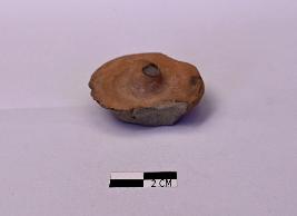 | Description / विवरण | A miniature circular terracotta lid with a small knob in this centre. The object is partially broken |