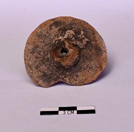 | Description / विवरण | A well baked terracotta toy cart wheel ,broken around its periphery. The protruded hub is damaged partially . The other side of this wheel is completely flat |