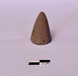 | Description / विवरण | Pointed cone shaped indeterminate terracotta object having 4 pin hole perforations near the base.The object is hollow inside ( could be a locket ) |