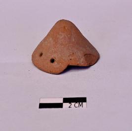 | Description / विवरण | Indeterminate terracotta object having a conical shape there are set of double perforations near the wide open end. The object is hollow inside |