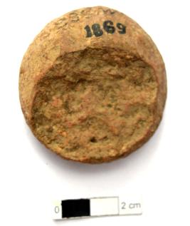 | Description / विवरण | It is an almost circular terracotta sealing of baked clay, the impression of Buddhist creed written on it in eighteen lines can be observed. |