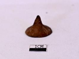 | Description / विवरण | A terracotta gamesman witha flat circular disk shaped base topped with a conical knob pointed on the top.The appearance is brown in color and has a rough surface texture |