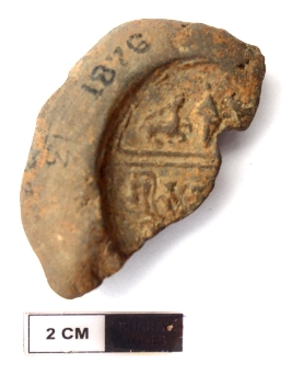 | Description / विवरण | It is a broken circular terracotta sealing of baked clay, the upper half, which is separated from the lower by double horizontal line, depicting two deer and a wheel in-between. |