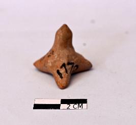 | Description / विवरण | An unidentified terracotta object with three pointy legs and a knob on their top. ( could be a games-man) |